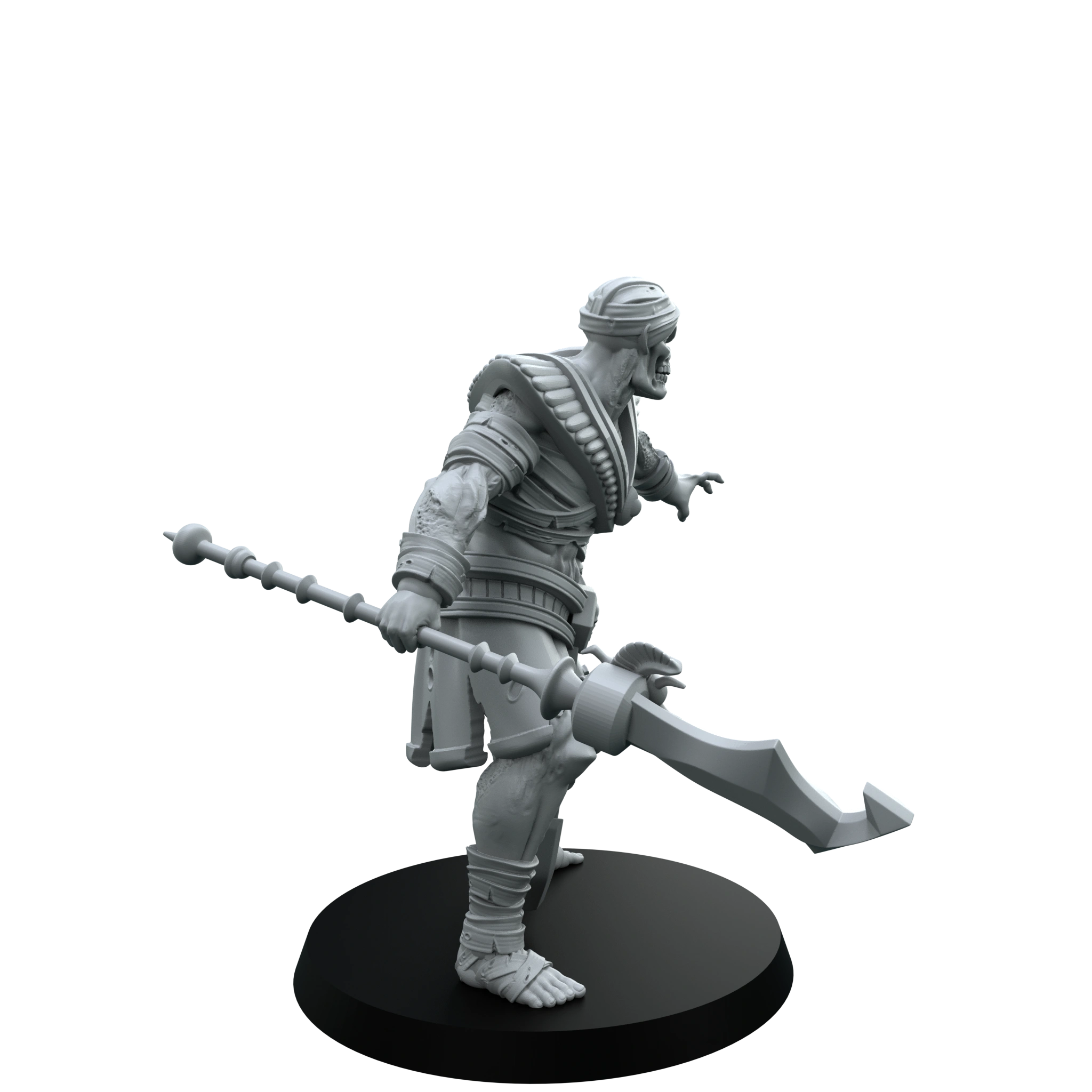 Undead temple guardian with a hooked polearm, wrapped in burial bands and clad in ceremonial armor. Ideal as a wight captain or mummy warrior.