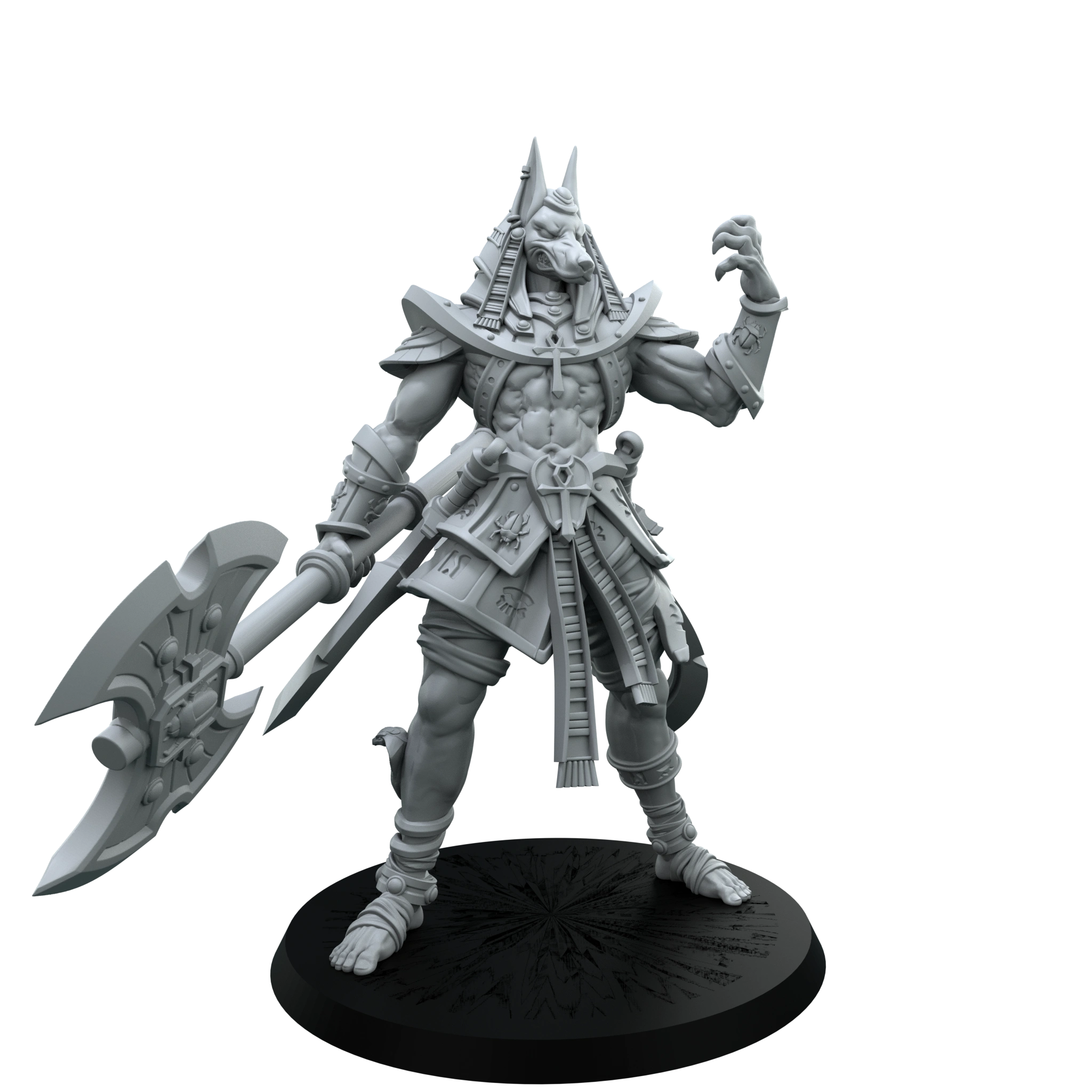 Jackal-helmed champion with a massive double-headed axe and ornate desert-kingdom armor, ideal as a leader or elite guardian for your forces.