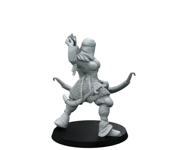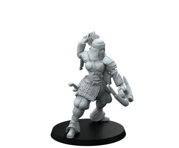 This sculpt captures the tension of a poised shot, with detailed clothing and practical gear suited to a life on the run. Painters can experiment with muted forest tones, worn leather textures, and weathered equipment to reflect the harsh life of an outlaw. Subtle highlights on the bow and arrows help emphasise the miniature’s role as a ranged threat on the tabletop.