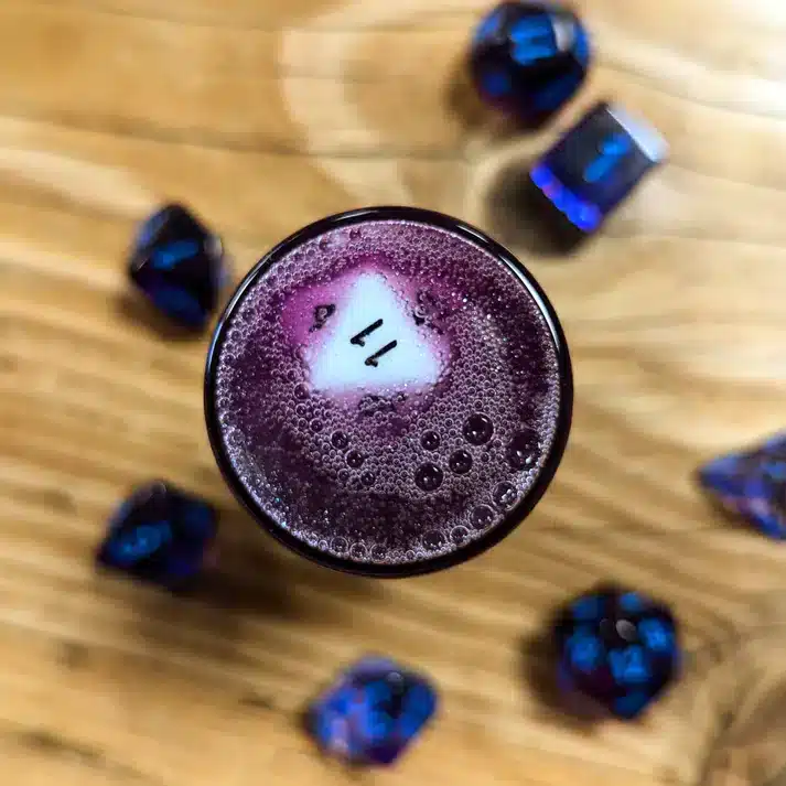 Charisma is a pink to pinky blue colour change potion with a floating D20 dice, inside a glass jar with a wax seal top.