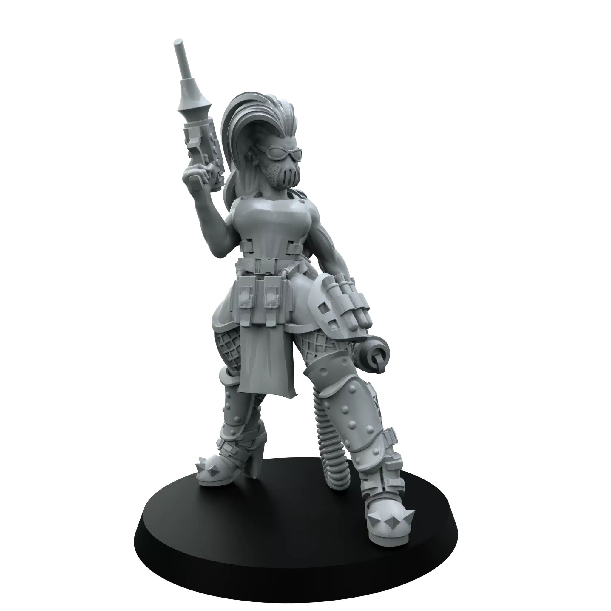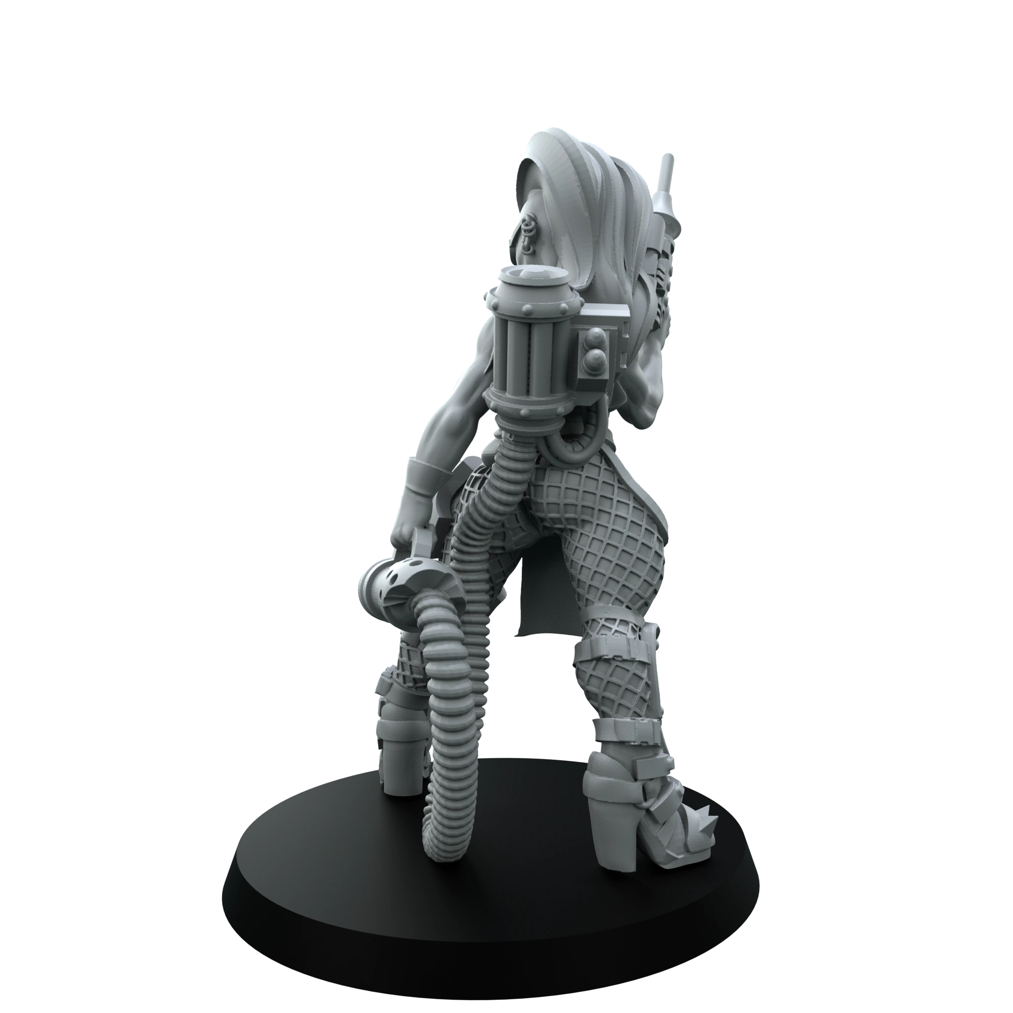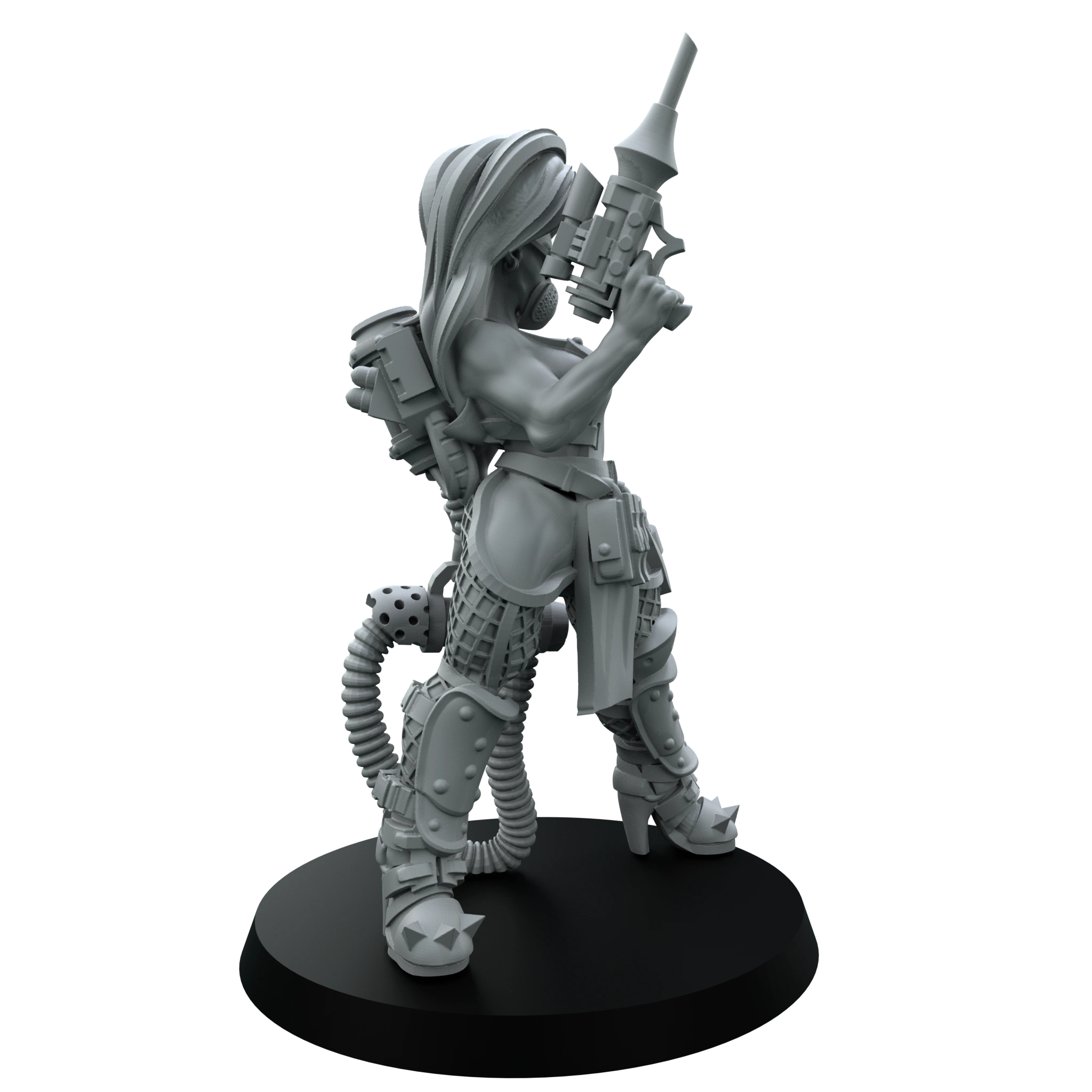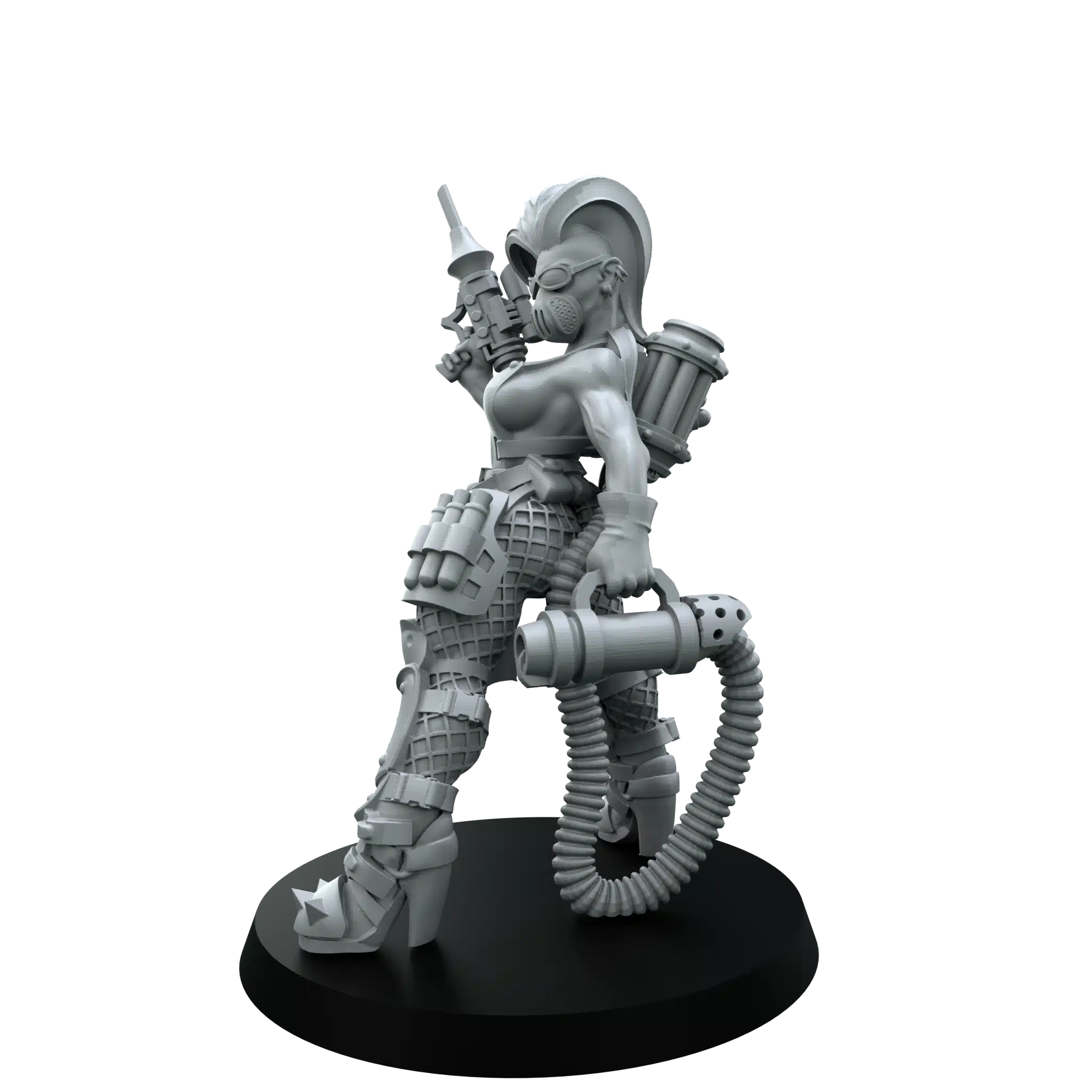 Use her as a volatile support specialist, gang leader, or objective runner in industrial zones and toxic ruins. The sculpt’s clear lines and bold stance make for fast, rewarding painting, from hazard stripes on armor to grimy chem-stains on the tank and sprayer.