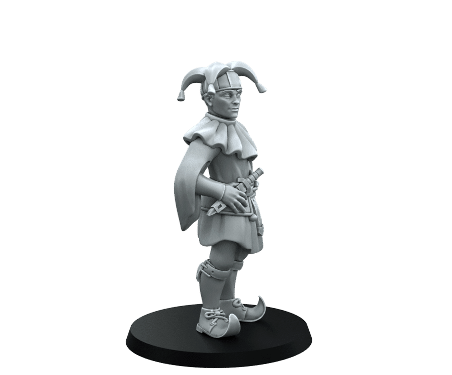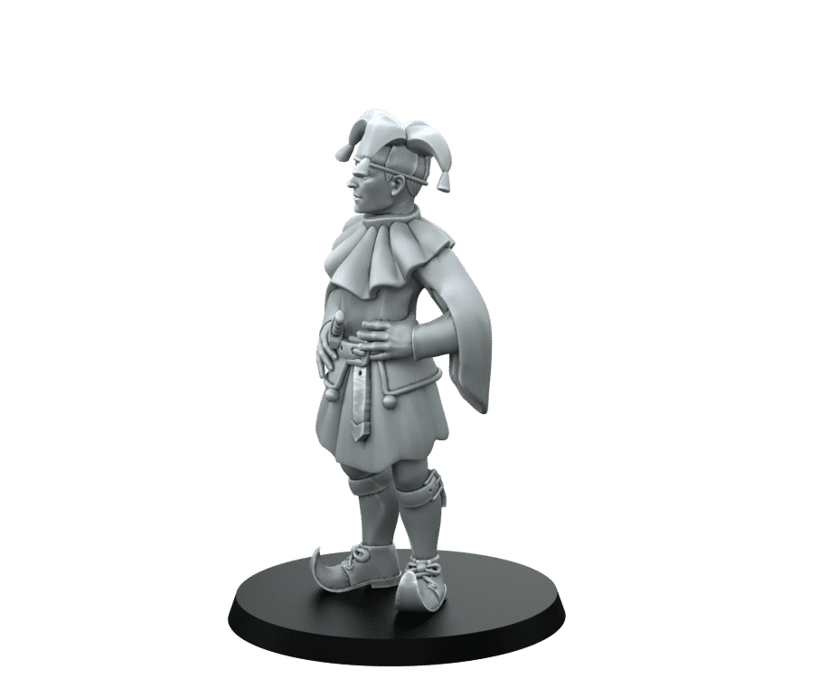 Modelled as the classic medieval court jester wearing his cap and bells hat and pointy shoes. With the will to entertain and the knife to scare.  This model from RN Estudio is designed in the DnD Fantasy Style.