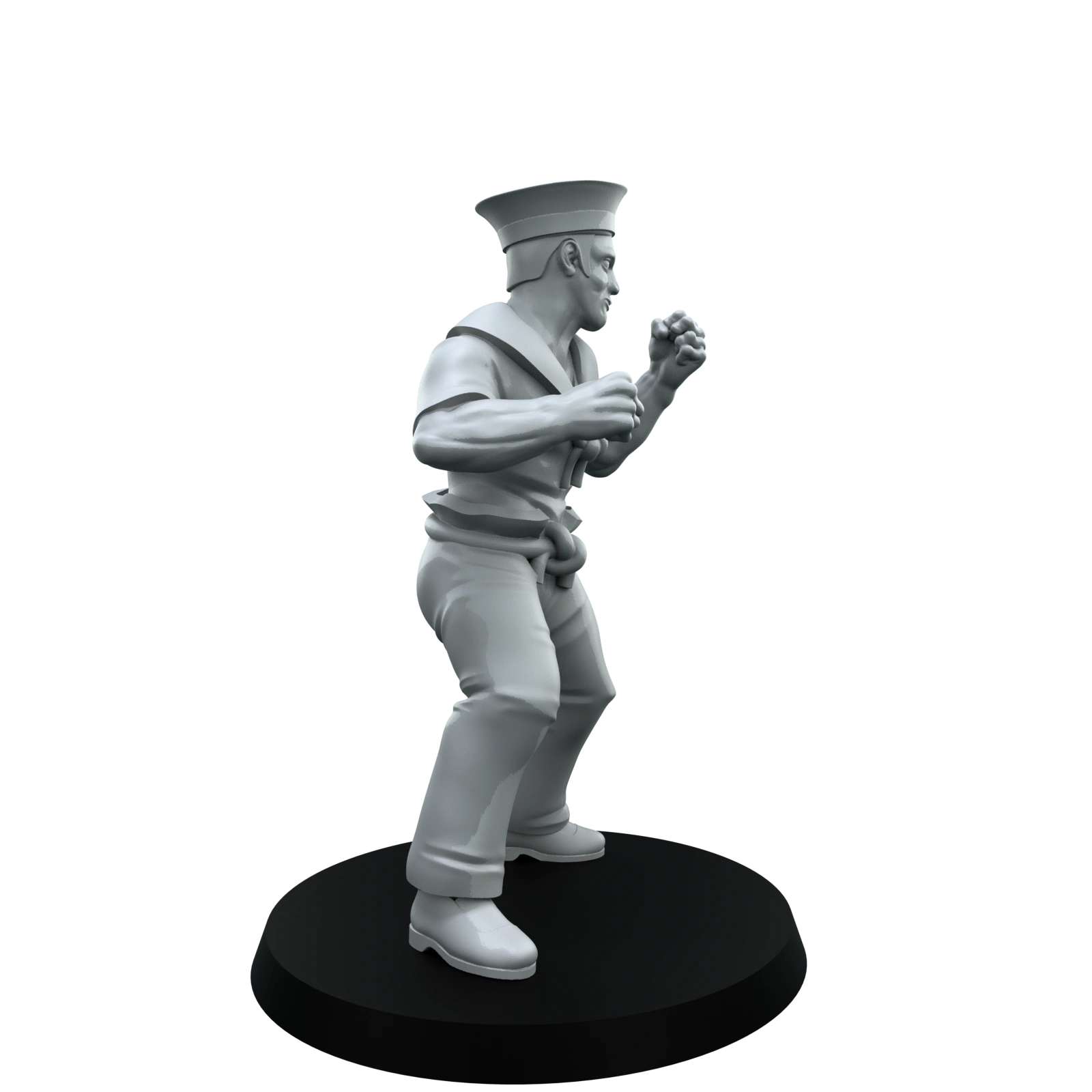 This deckhand strides into a boxing stance, shoulders forward and fists clenched, the picture of shipboard grit. He wears a classic flat sailor cap, wide-collared shirt with knotted scarf, and a tied sash at the waist. Crisp folds in the clothing and a determined, square-jawed expression sell the moment just before the first swing.