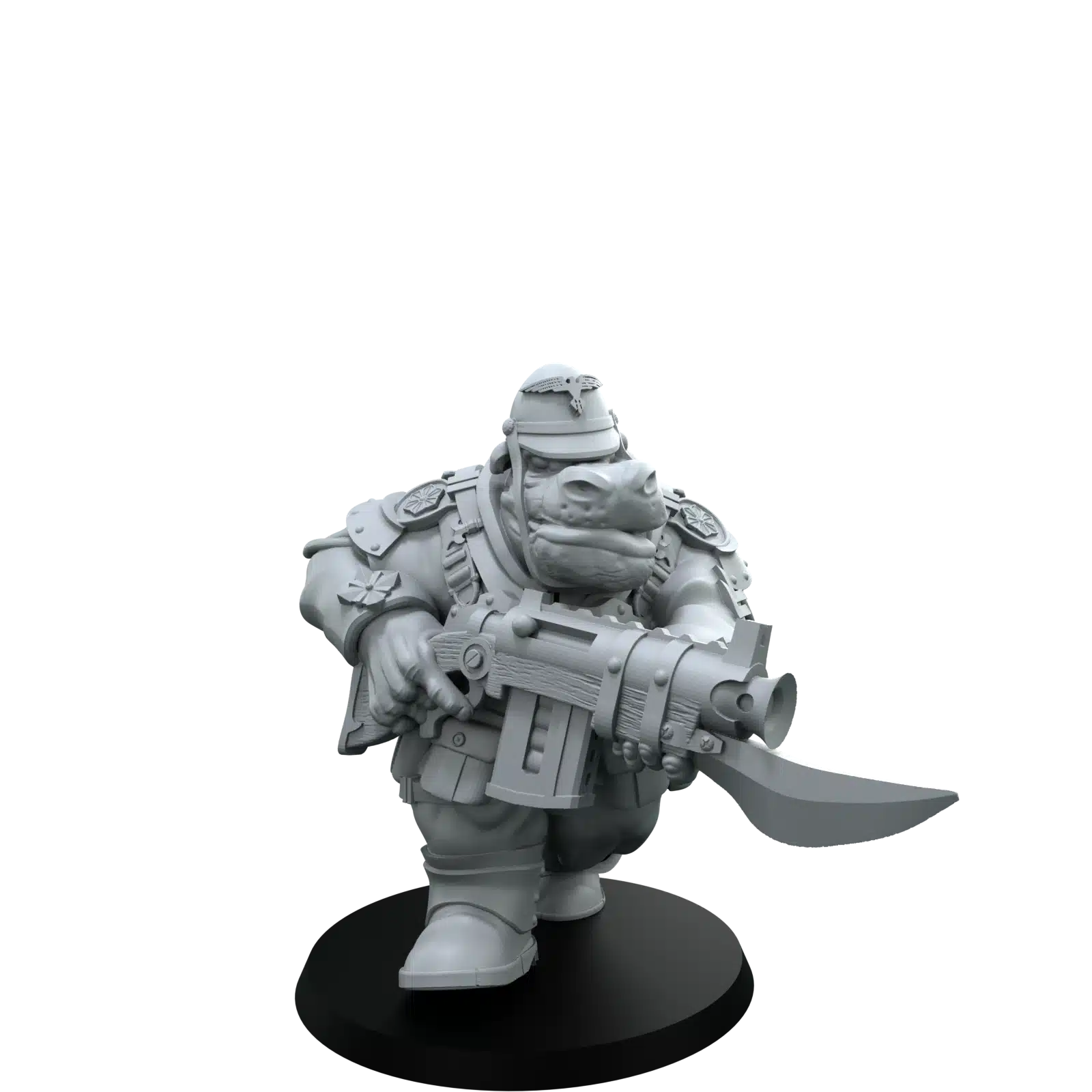 This imposing hippo soldier barrels forward, weapon at the ready and boots biting into the mud. The sculpt captures a determined, no‑nonsense stride, broad shoulders set beneath layered plates and a spiked field cap strapped secure. It’s a characterful centerpiece for any grim warfront, built to look like it’s moments from breaching the enemy line.