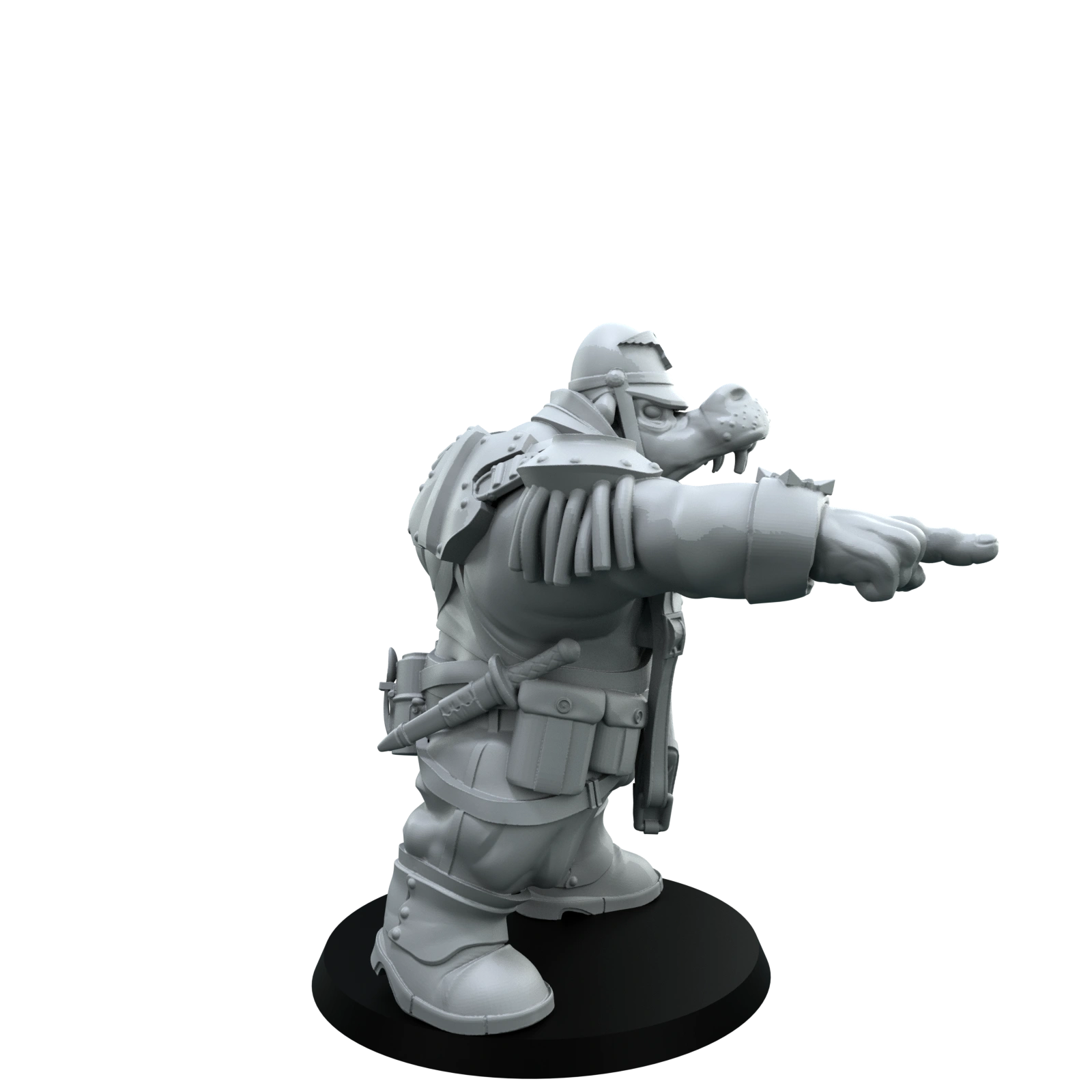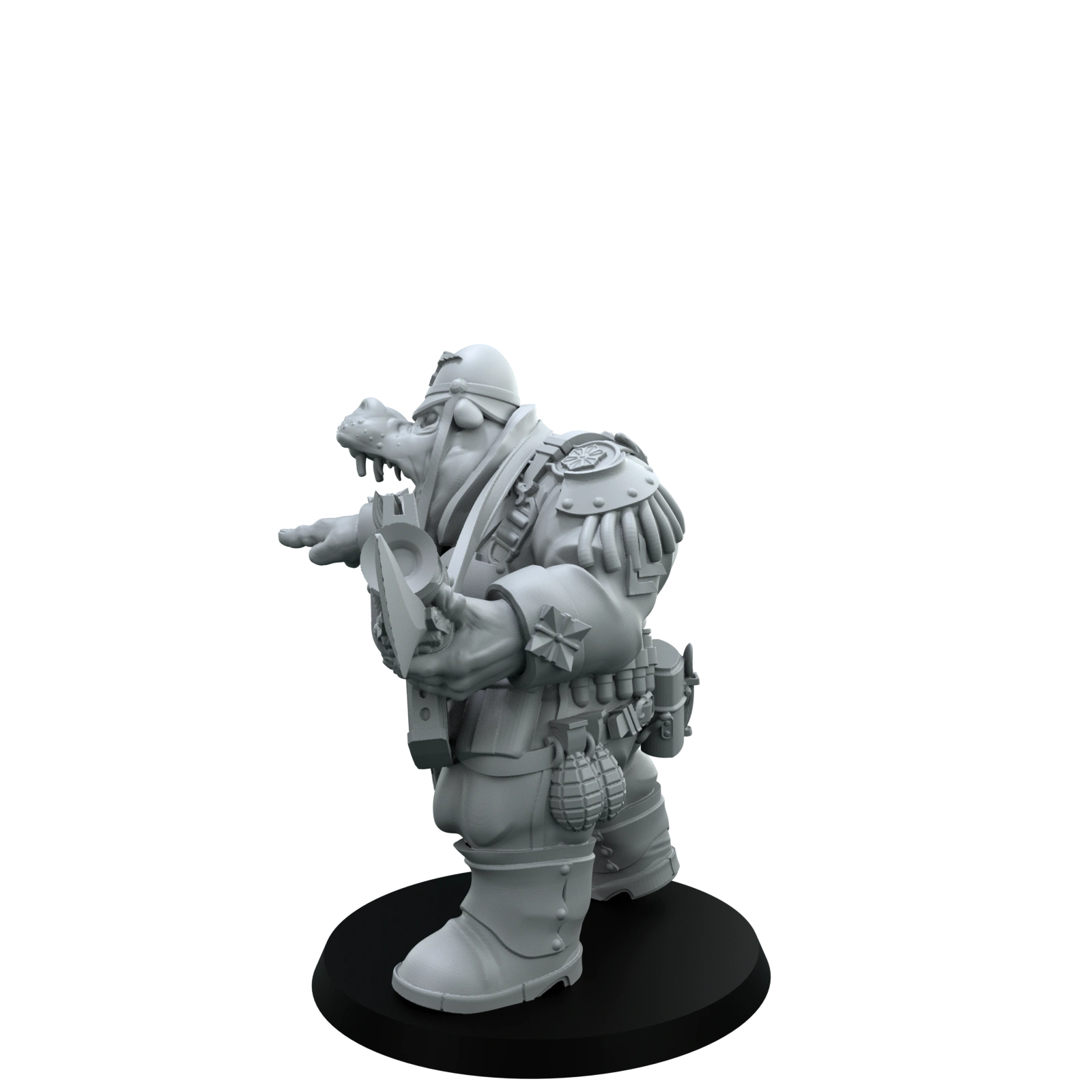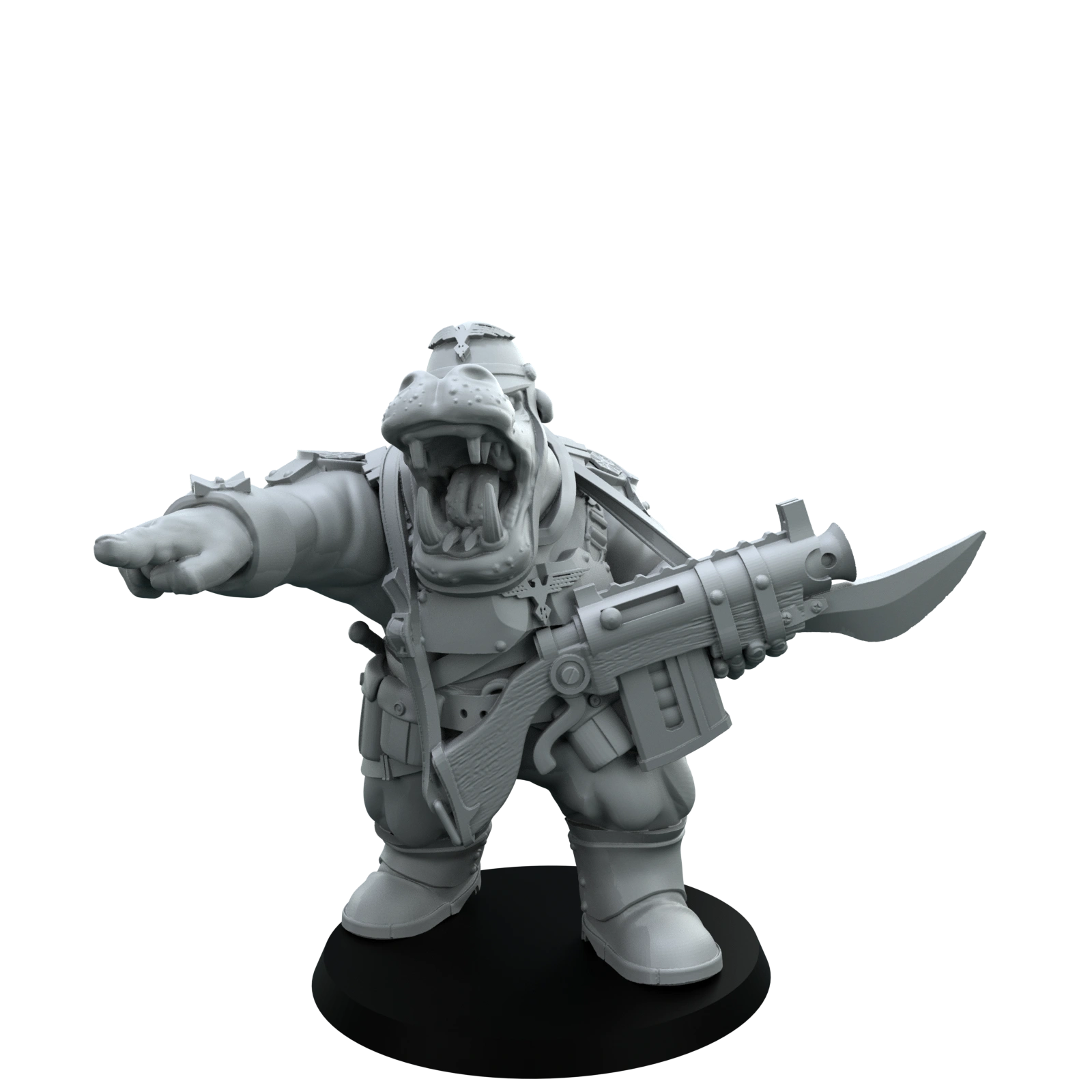 This imposing miniature depicts a broad-shouldered hippo trooper mid-roar, jaw wide and tusks bared as he drives the squad forward with an outstretched finger. He’s clad in layered armour with chunky boots and a decorated shoulder pad, while a cap with a small badge crowns his thick neck and folds. Pouches, straps and grenades hang from his webbing, giving him the look of a veteran who’s ready for anything.