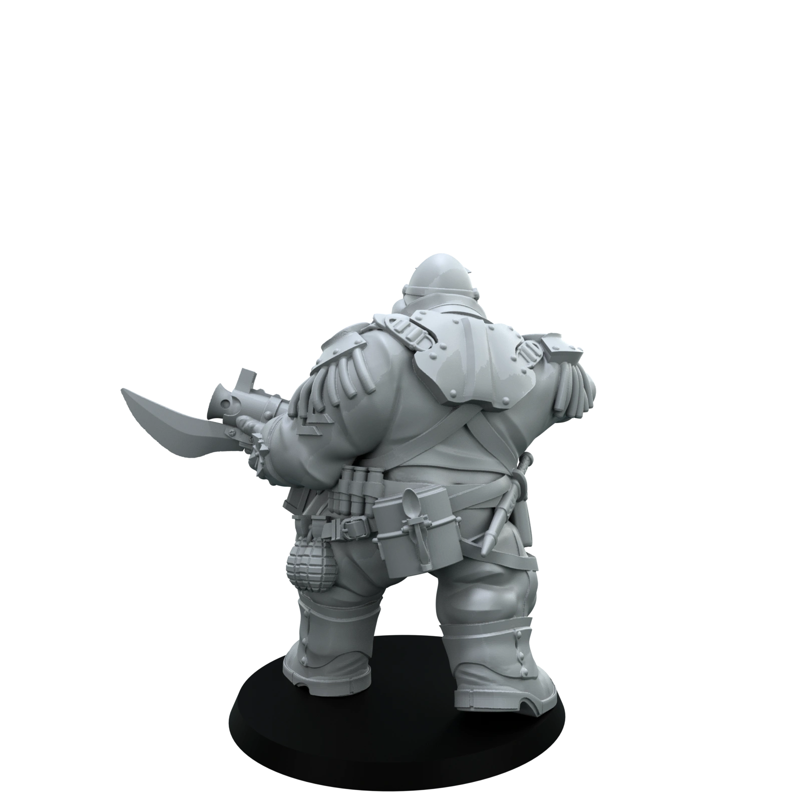 In his other hand he grips a brutal rifle, its oversized frame finished with a heavy blade fixed beneath the barrel. Rivets, vents and panel lines add industrial character across the weapon and armour, with crisp edges that read clearly from arm’s length on the tabletop. The assertive stance and command gesture make him a natural sergeant, enforcer or elite line breaker in any grimdark force.
