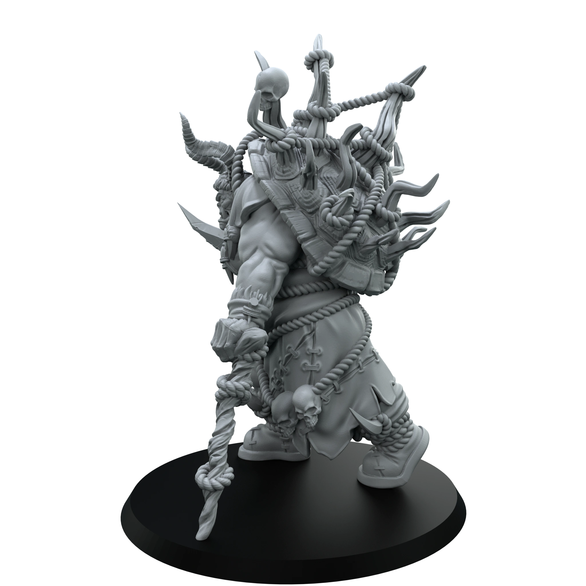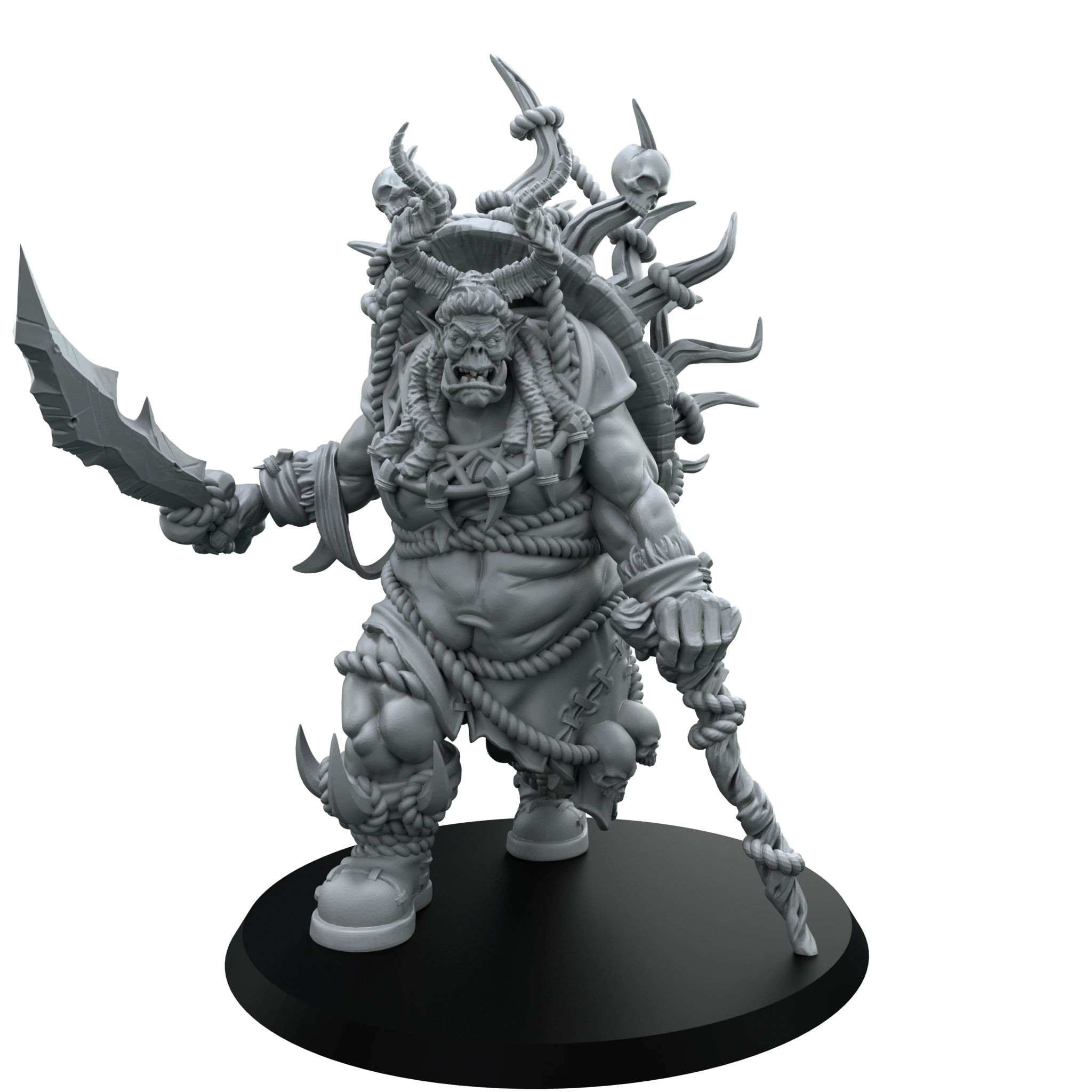 The sculpt bristles with texture—rope fibers, torn leather, chipped edges on the blade, and a weathered staff—ideal for bold contrast paints or layered highlights. Use him as a tribal shaman, savage mage, or fearsome war-leader; his presence reads instantly on the tabletop and anchors any warband of brutal raiders or spirit-bound clans.