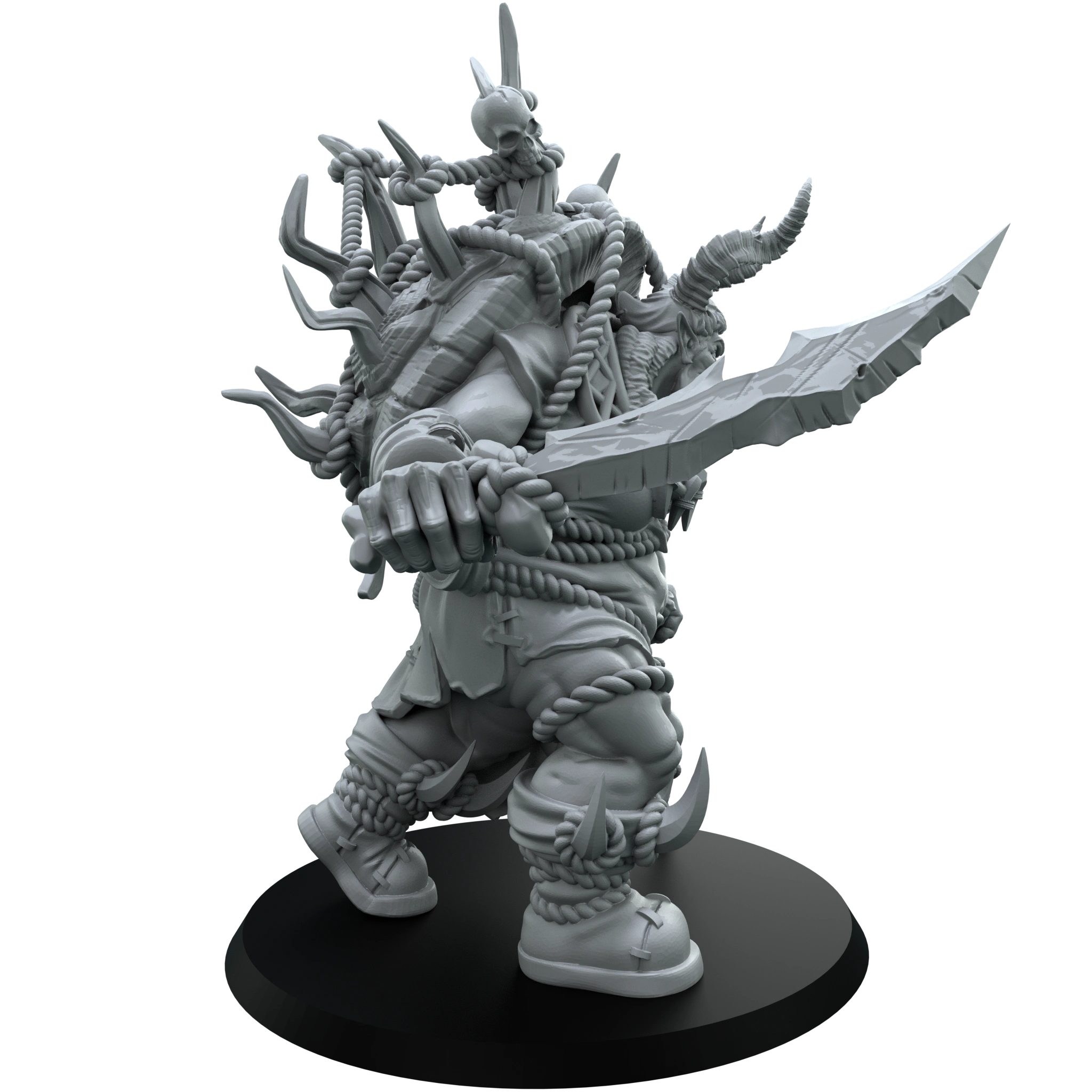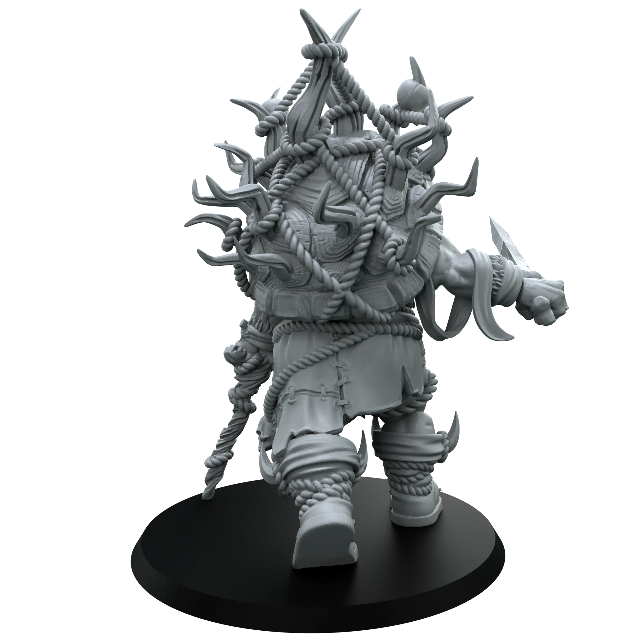 This imposing shaman strides forward with a tusked snarl, cleaver angled for the kill and staff clenched tight. Thick ropes coil around his torso and limbs, knotting over a horned headpiece and layered hides. Stitched panels and rough wraps reinforce his gear, giving him the look of a veteran ritualist who leads from the front.